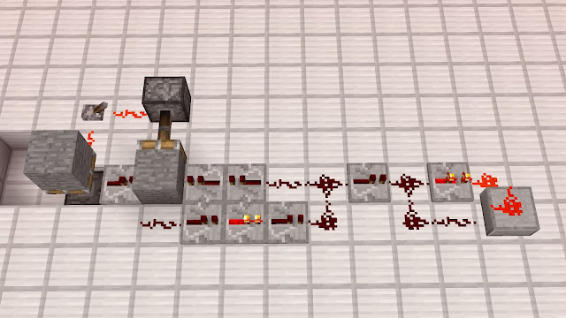 次にこの発信回路からの出力をつなぐ先のスイーパー部分のスクショを載せます。 (水色の羊毛ブロックの左側の上付きハーフブロックが上記回路の出力です)